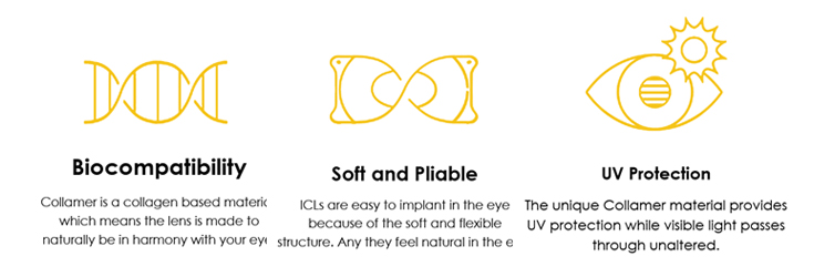 ICLs, also known as Phakic intraocular lenses (PhakicIOLs), correct vision in much the same way that external contact lenses do, except ICL is placed inside the eye where they permanently improve vision. They are micro thin lenses implanted over the natural lens, inside the eye, to correct spectacle power. The Collamer base of the lens material is 100% biocompatible, which is designed to work in harmony with your body’s chemistry.